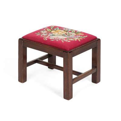 the chair with a pierced interlaced splat and stuffover seat, on chamfered legs with stretchers; the stool with a drop-in needlework seat raised on similar legs with stretchers