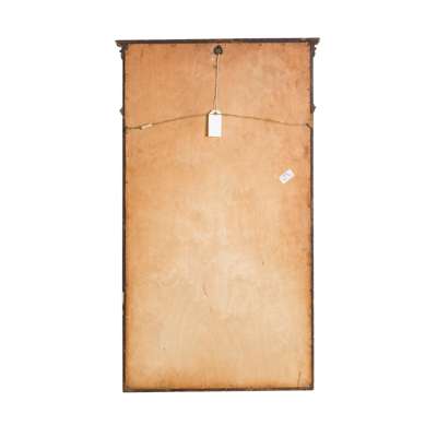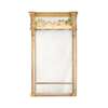the bead moulded cornice above a verre églomisé landscape, flanked by carved urns and flowers, over a divided mirror plate flanked by Corinthian pilasters