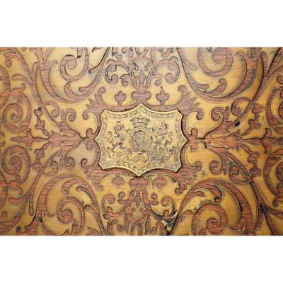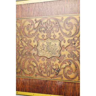 inlaid with scrolling foliate brass and cartouche engraved with the coat of arms of the Dukes of York & Clarence and inscribed with mottos HONI SOIT QUI MAL Y PENSE/ QUO PAX ET GLORIA DUCUNT, with brass handles to each side, enclosing a void interior; together with a VICTORIAN ROSEWOOD AND BRASS INLAID LAP DESK, opening to a fitted interior with green leather writing surface, 46cm wide, 17.5cm high, 25.5cm deep (52cm open)