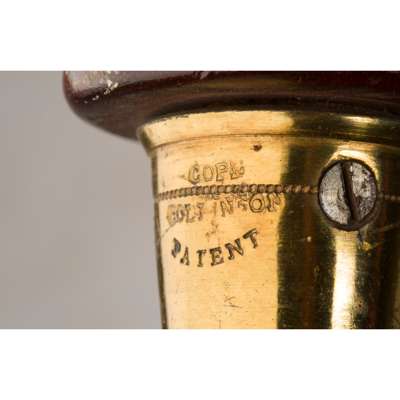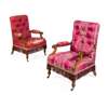 with rectangular button backs above open padded arms with scroll supports, over padded seats, raised on ring-turned tapering legs with brass caps and castors stamped COPE & COLLINSON PATENT; covered in red silk damask with tassel trim