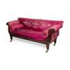 with a low upholstered back and outswept arms with acanthus carved facings, above a long squab and bolster cushions, the seat rail centrally carved with an anthemion, raised on turned and reeded legs with brass caps and castors; covered in red and gold silk damask