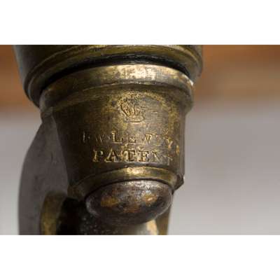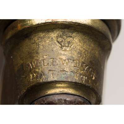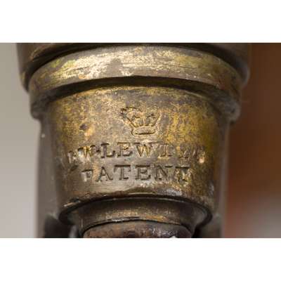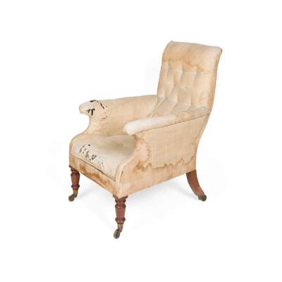to include an armchair with a button upholstered back above enclosed arms and a stuffover seat, raised on ring-turned tapering legs with brass caps and castors stamped J M LEWTY'S PATENT; and a side chair with a padded upright back and stuffover seat, raised on lappet carved legs, also with Lewty's Patent brass caps and castors
