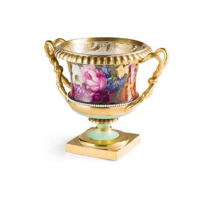 of campana form, the gilt gadrooned rim above entwined twin handles terminating in moulded vine leaves, the gilt decorated body painted with a continuous band of polychrome flowers and a beaded border, raised on a green-painted socle foot and gilt square base, painted maker's marks BARR FLIGHT & BARR/ ROYAL PORCELAIN WORKS/ WORCESTER/ LONDON ***/ NO. 1 COVENTRY STREET