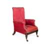 the rectangular back and seat with outswept arms, above a stuffover seat and moulded seat rail, with a pull-out adjustable footrest, raised on ring-turned tapering front legs with brass caps and castors, the front right leg stamped G MINTER, 33 GERRARD ST, SOHO WR PATENT 467; covered in red patterned silk
