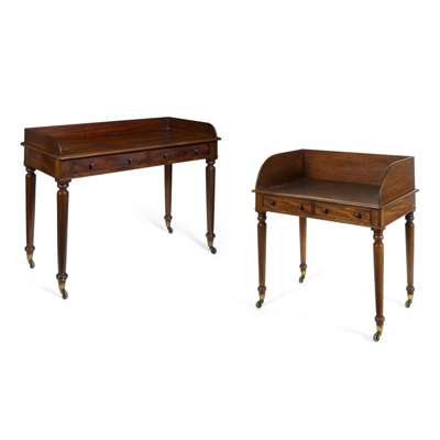 the first with a high three-quarter gallery above two false drawers, raised on ring turned tapered legs with brass caps and castors; the other with a three-quarter gallery and two frieze drawers, raised on turned tapered legs with brass caps and castors