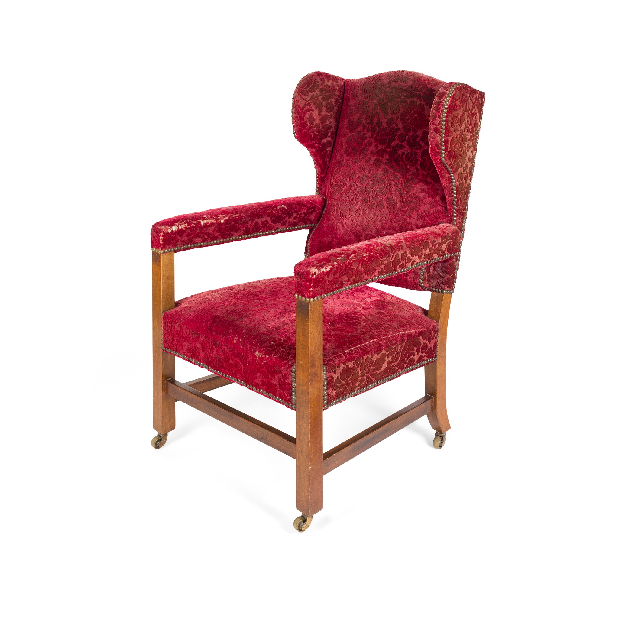 with arched wingback above padded open arms and a stuffover seat, raised on straight square legs linked by stretchers, with brass castors stamped HOWARD & SONS, the rear leg stamped 1298/6598; covered in red blocked velvet