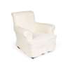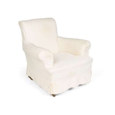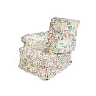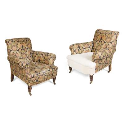 with a scroll-top backs and outswept arms above stuffover seats, raised on ring-turned front legs with ceramic castors; covered in an Art Nouveau foliate print fabric, one with a cream slipcover, the other with a floral slipcover
