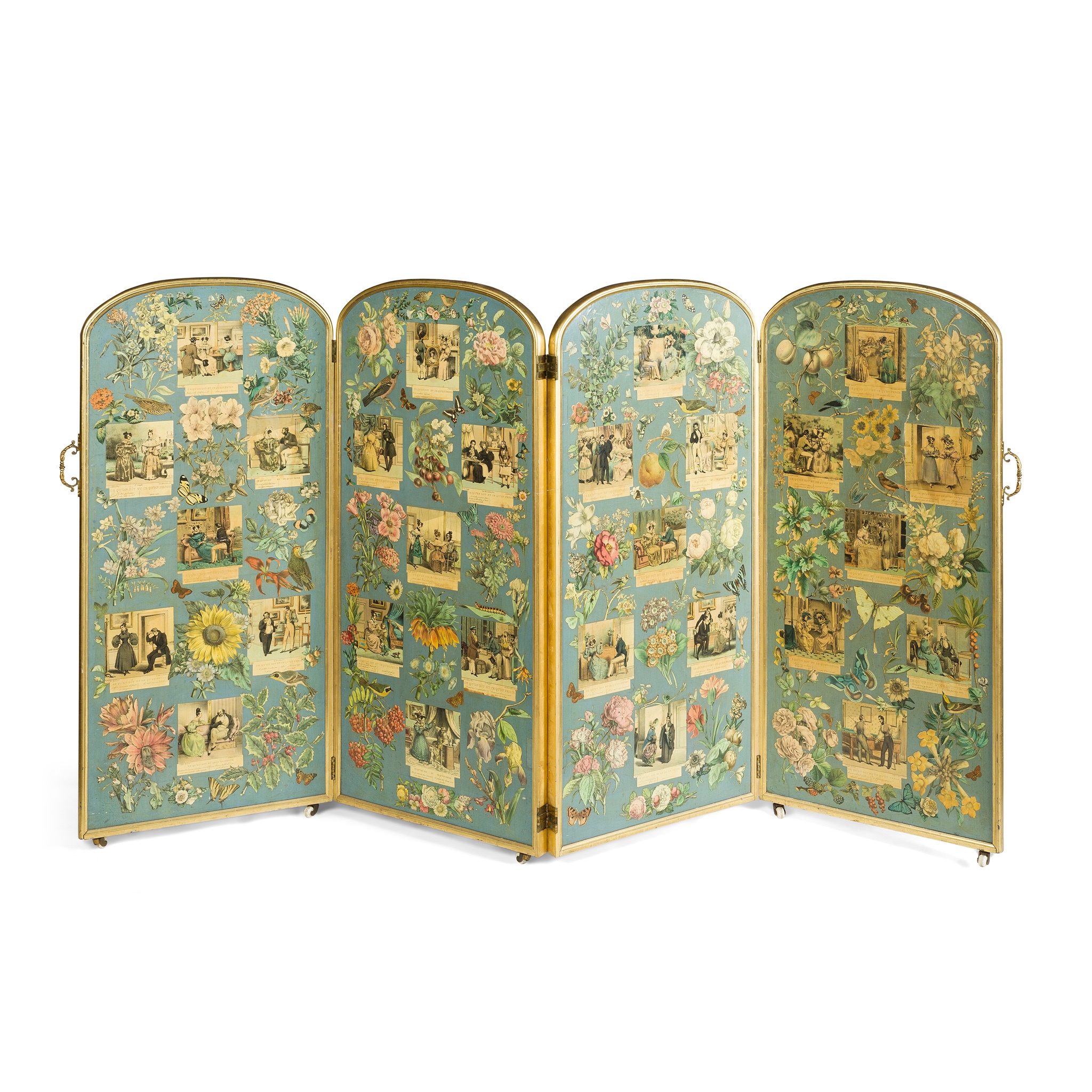 each arched panel in a giltwood frame, with printed scenes of domestic life and scrapwork birds, insects and flowers