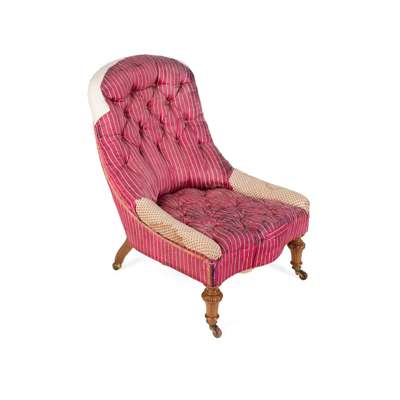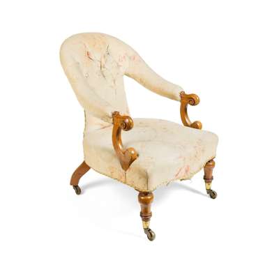 the first walnut framed with a low button back and open arms with scrolled uprights, above a stuffover seat, raised on ring-turned tapering legs with brass caps and castors; the second a mahogany framed nursing chair with a curved button back and seat enclosed by low arms, raised on ring-turned and fluted legs with brass caps and ceramic castors, stamped '2148', the castors stamped PATENT