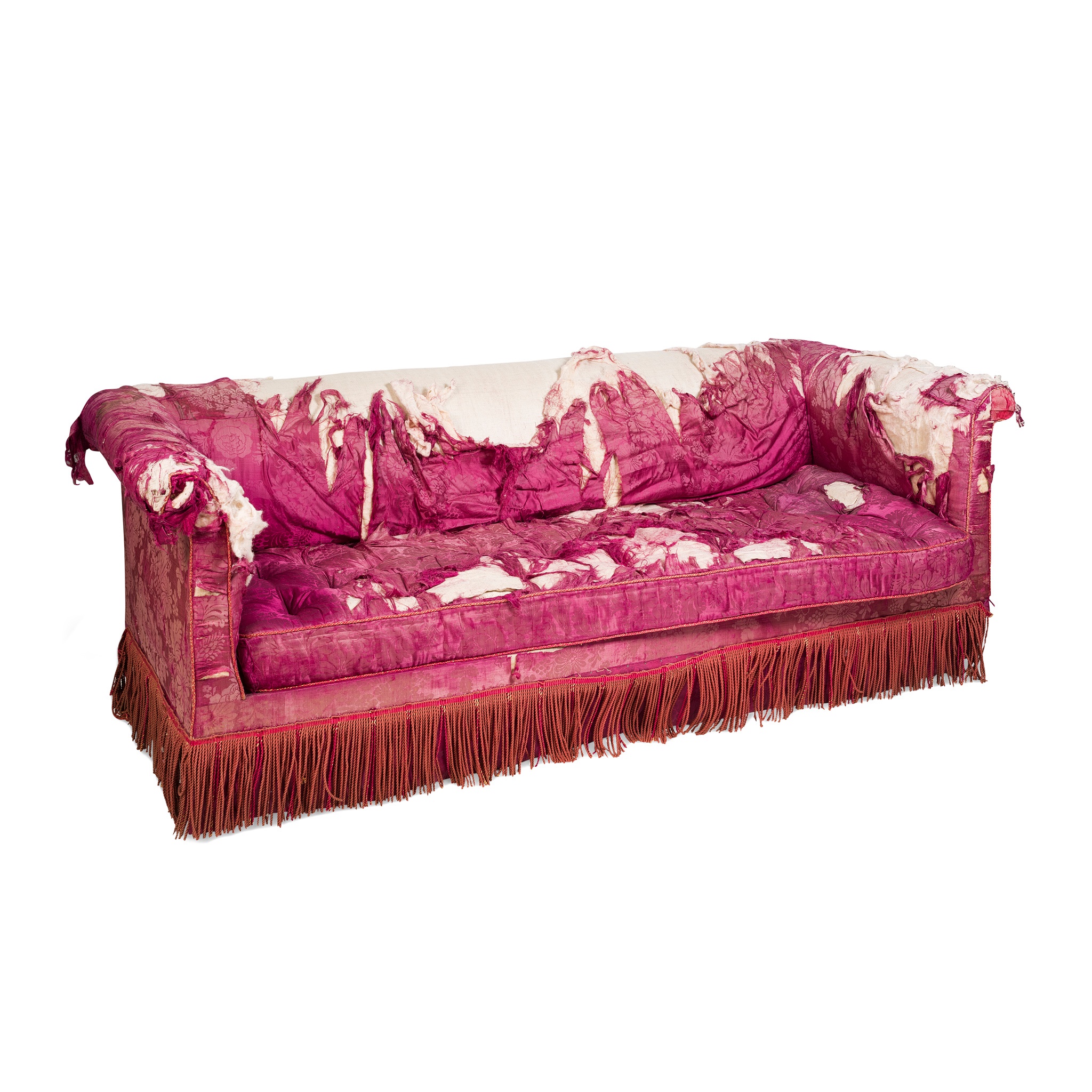 with a low back and outscrolled arms above a long cushion seat, raised on ring-turned legs with bulbous feet, with brass caps and castors; covered in distressed red damask with a deep fringe trim
