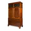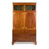 the upper section with astragal glazed doors and painted interior, flanked to either side by twin drawers, the central section witha pair of panelled doors with fan inlay enclosing five slides, the base with two short and two long drawers, raised on bracket feet