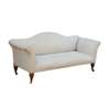 the serpentine back enclosed by high scrolled arms above a long stuffover seat, raised on turned and tapering moulded legs terminating in brass caps and castors, the rear leg stamped 3(?)612; in cream upholstery