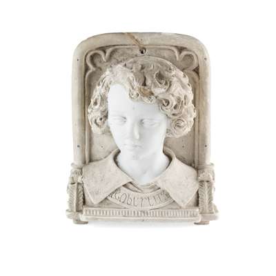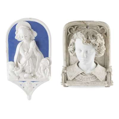 the first a Cantagalli example in the della Robbia style, in blue and white glazed terracotta depicting the Virgin and Child with John the Baptist, painted blue cockerel mark; the other a RENAISSANCE REVIVAL PLASTER PLAQUE, modelled as the bust of a boy in an architectural niche, the face overpainted in white, inscribed ROBERTUS, 31cm high
