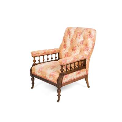 with rectangular button back, the padded arms on turned spindle supports, the front rail centred by roundels, raised on ring-turned legs, the seat rail with brass plaque 'J. SHOOLBRED, TOTTENHAM HOUSE, LONDON', the rear leg stamped 4092; in an Art Nouveau peach and coral foliate print fabric