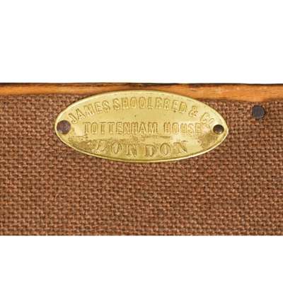 VICTORIAN MAHOGANY-FRAMED UPHOLSTERED ARMCHAIR, BY JAMES SHOOLBRED & CO., LONDON