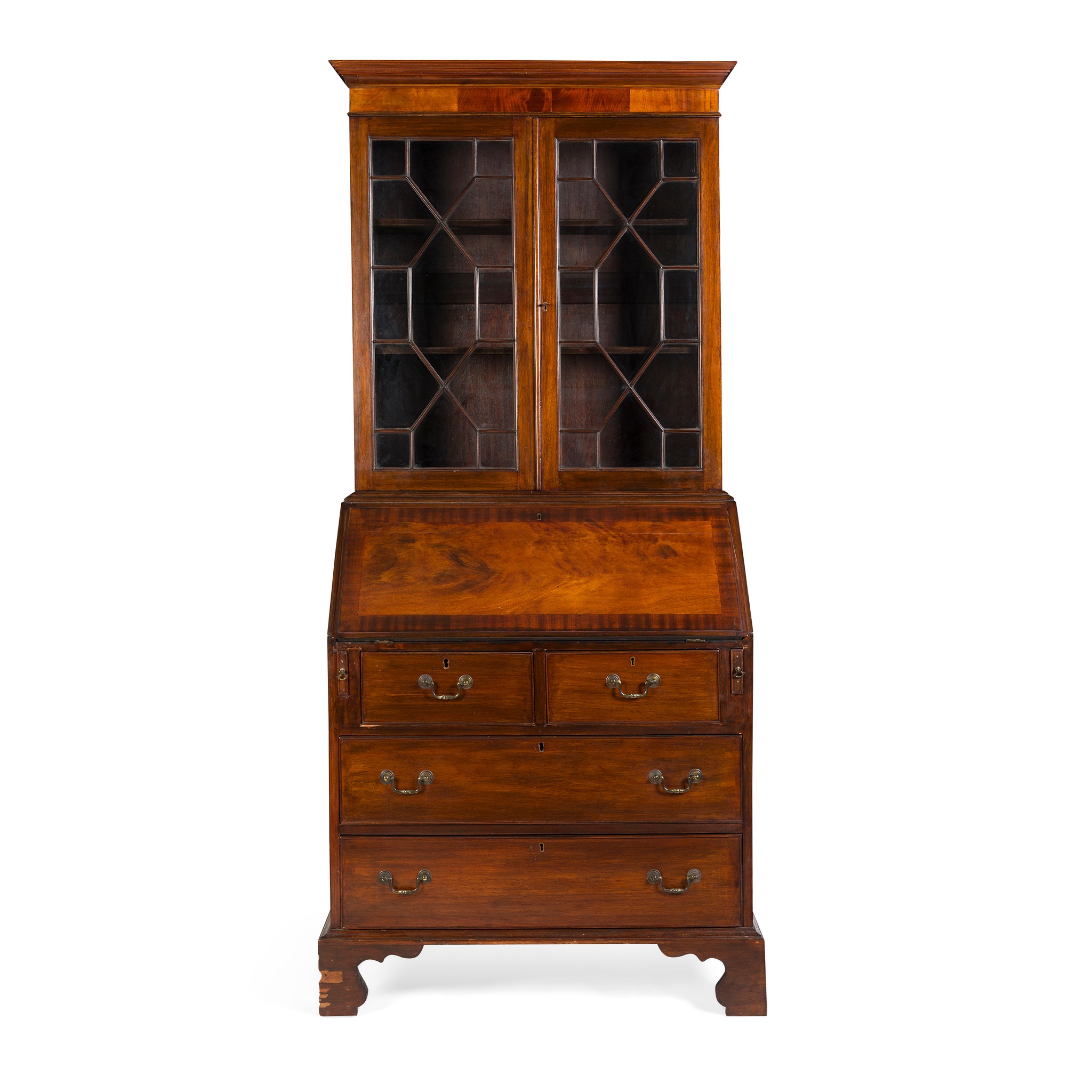 the moulded cornice above a pair of astragal doors enclosing adjustable shelves, the crossbanded fall enclosing an interior fitted with pigeon holes and drawers flanking a cupboard, above two short and two long drawers, raised on bracket feet