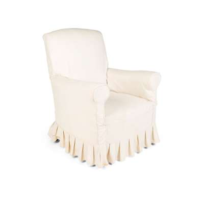 the slightly arched back above rounded arms and a stuffover seat, raised on square tapering legs, the rear leg stamped 4131/4116, the castors stamped HOWARD & SONS, LONDON, covered in Howard & Sons monogram fabric, with a cream slipcover