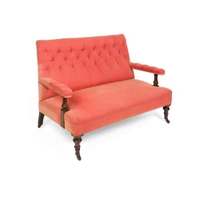 with a rectangular button back, padded open arms and turned supports, raised on turned legs with ceramic castors; covered in coral pink upholstery