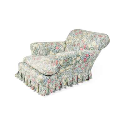 with a padded raked back above scrolled arms and a deep seat with squab cushion, raised on ring-turned front legs with ceramic castors, with a Morris & Co. 'Golden Lily' pattern slip cover