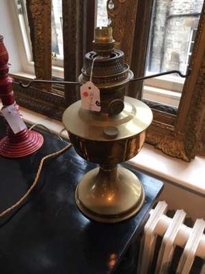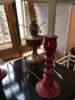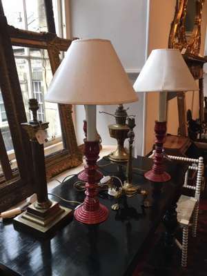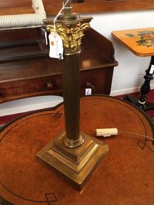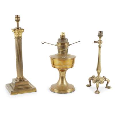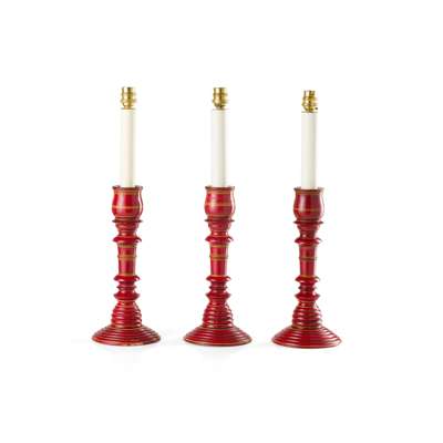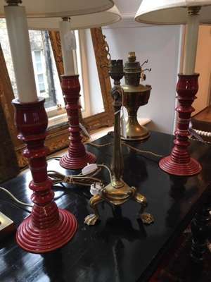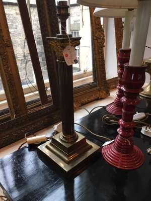 to include a Corinthian column lamp, a candlestick lamp with tripod base, and an oil lamp, converted to electricity; together with three red lacquer candlestick lamps with paper shades; together with THREE WOODEN TABLE LAMPS painted red with green and yellow banding, knobbed column on round domed base