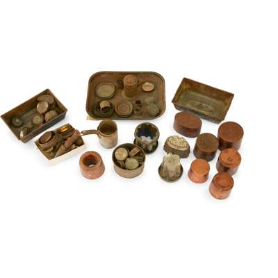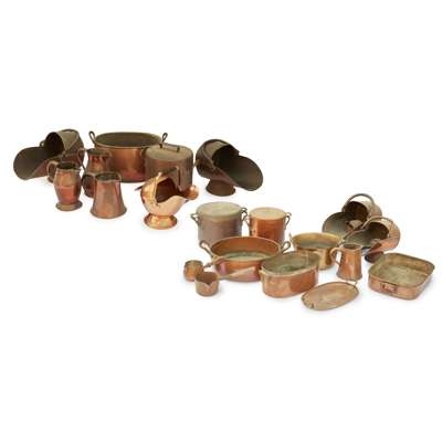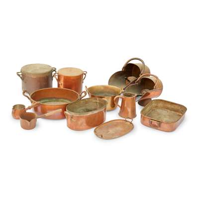 to include a TWIN-HANDLED HOT WATER PAN AND COVER, 38cm diameter, 27cm high; a LARGE TWIN-HANDLED PRESERVE PAN, 55cm diameter; a JUG, 25cm high; a CYLINDRICAL TWIN-HANDLED PAN AND COVER, 30cm diameter, 31cm high; TWO SAUCE PANS, 16.6cm and 15cm diameter; a TWIN-HANDLED ROASTING PAN, 52cm long, 12cm high, 40cm deep; a FISH KETTLE AND COVER, 47cm long; a CYLINDRICAL TWIN-HANDLED PAN AND COVER, 33.5cm diameter, 36cm high; a LARGE SWOLLEN BODIED TWIN HANDLED POT, 64cm across including handles; a BALUSTER JUG, 35cm high; a TAPERED JUG, 26cm high; a SWOLLEN BODIED JUG, 31cm high; FIVE COAL SCUTTLES, various sizes; TWO JELLY MOULDS, 11cm and 14cm diam.; a GRADUATED SET OF JELLY MOULDS; and a QUANTITY OF ZINC-PLATED MARZIPAN, SWEETMEAT, AND OTHER MOULDS, various sizes