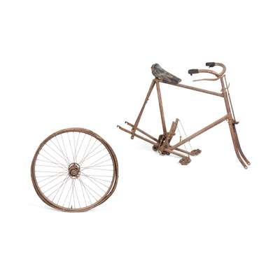 Note: Following the popularity of the iconic Penny-Farthing, bicycles in the late 19th century were very much seen as items of conspicuous consumption, and many considered cycling a dangerous sport for men. To ensure mass appeal, manufacturer's experimented with a range of technological innovations which would encourage the idea of cycling as a leisurely pursuit. This variation of the common safety bicycle has an unusual drive mechanism in which the pedals are connected to wire cables which pull the wheels forward via a coil and pulley system. In addition, the lower frame and equal sized wheels provide a far safer means of travel, which coined the term 'saftey bicycle'. Commonly used by police and postmen, this roadster-type design is very similar to the European City bike, which remains popular today, especially in Germany and the Netherlands.