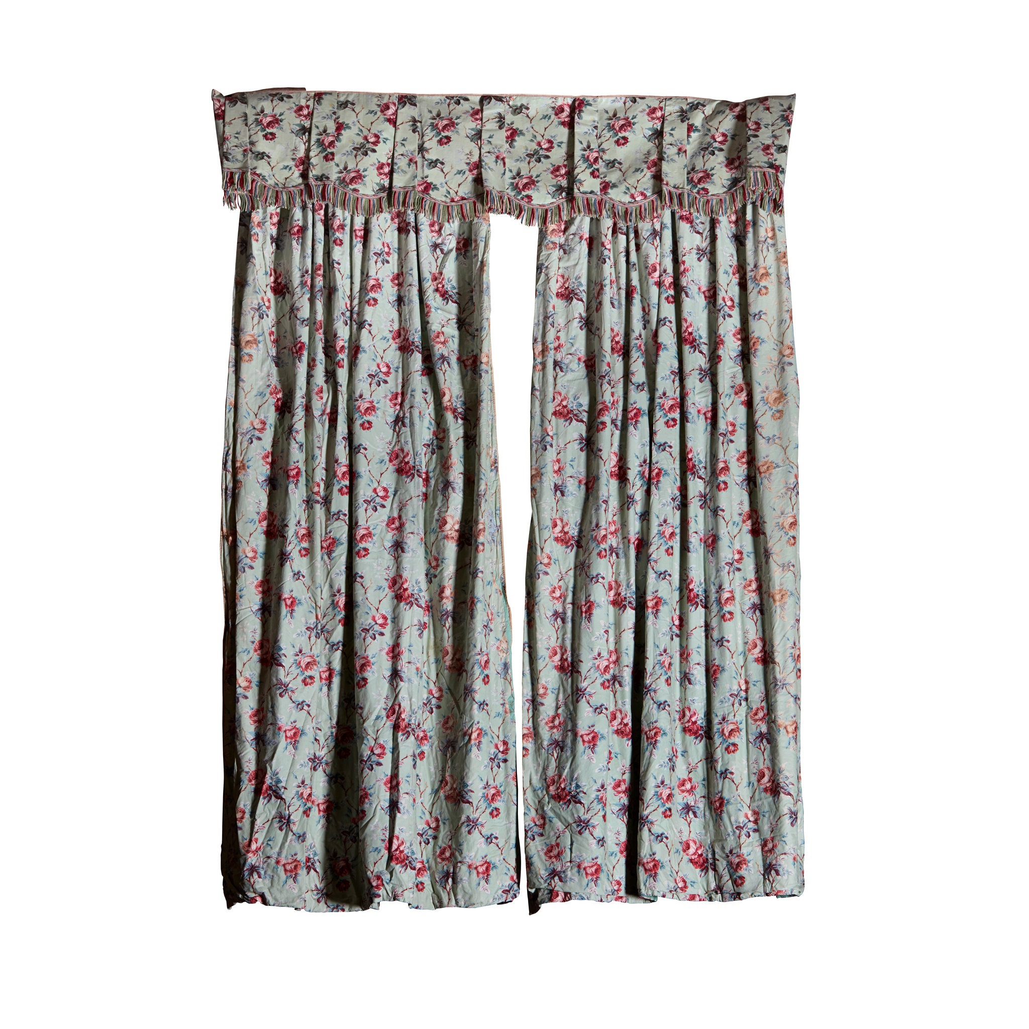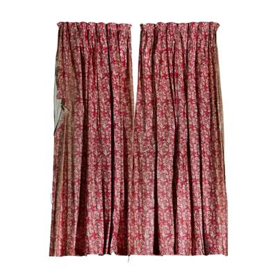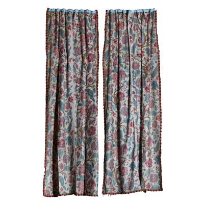 comprising a PAIR OF INDIAN FLOWER PRINT, with tassel trimming, unlined, each panel 380cm long, 200cm wide; a PAIR OF ARTS & CRAFTS CARNATION PRINT in rust and ecru colourway, unlined, each panel 291cm long, 248cm wide; and a PAIR OF CABBAGE ROSE PRINT, on a pale blue ground, unlined, with two pleated valances of various lenghts and assorted other small fabric pieces to match, each panel 272cm long, 182cm wide