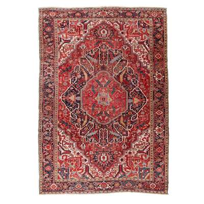 the brick red field with large indigo and salmon pink medallion, ivory, pink and indigo spandrels, within indigo turtle palmette and vine border