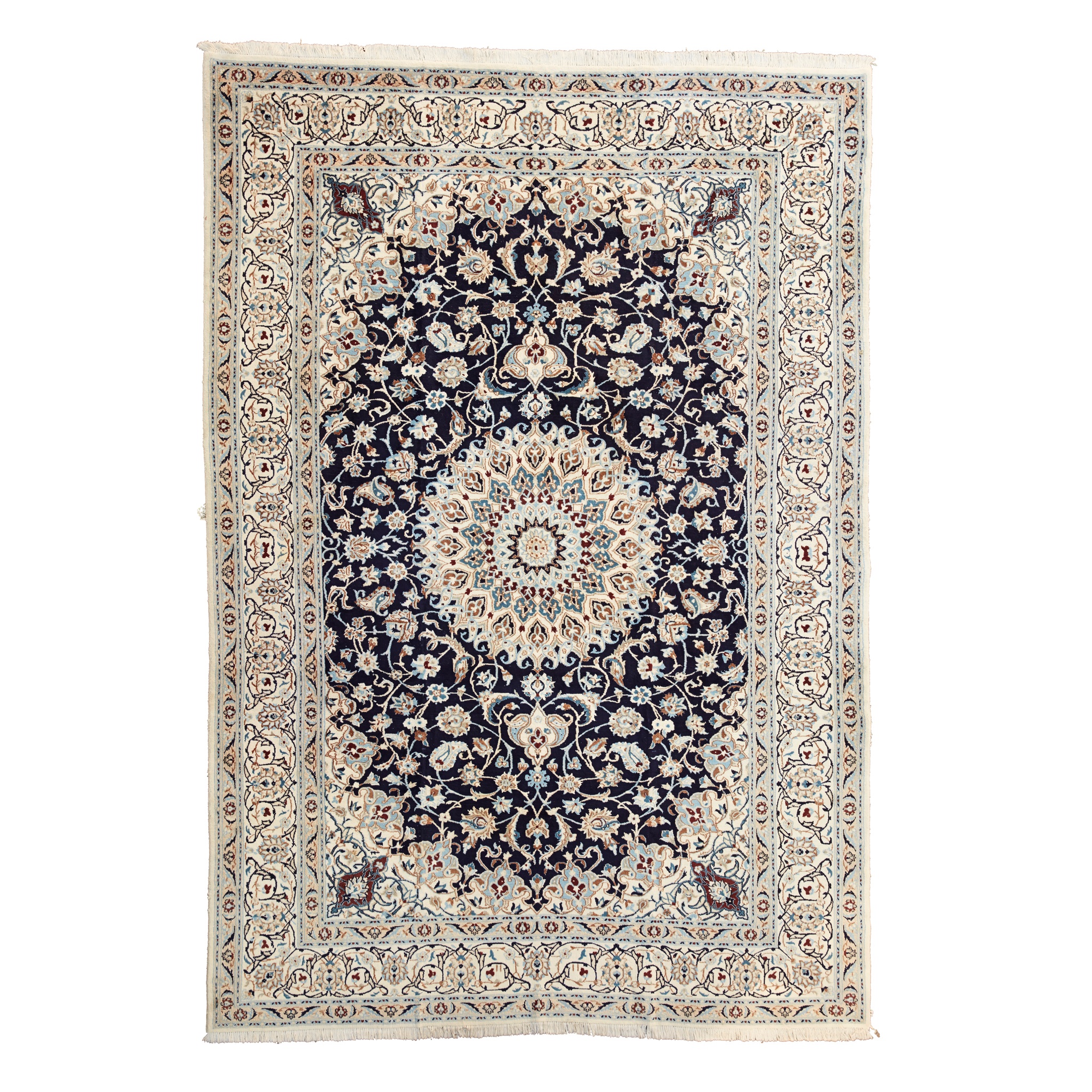 the indigo field with cream medallion, similar spandrels, within cream palmette and arabesque vine border