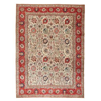 the ivory field with allover palmette and scrolling vine pattern, within red palmette and vine border, signature to one end