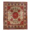 the green field with red medallion surrounded by four smaller medallions, similar spandrels, within yellow and indigo cusped border, star signatures to two corners