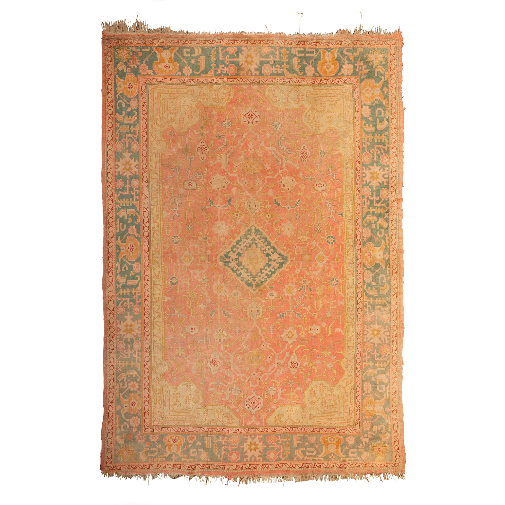 the salmon pink field with small turquoise medallion, cream spandrels, within turquoise stylised foliate border
