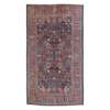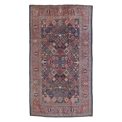 the indigo field with allover foliate lattice pattern and similar medallion, within red palmette and angular vine border