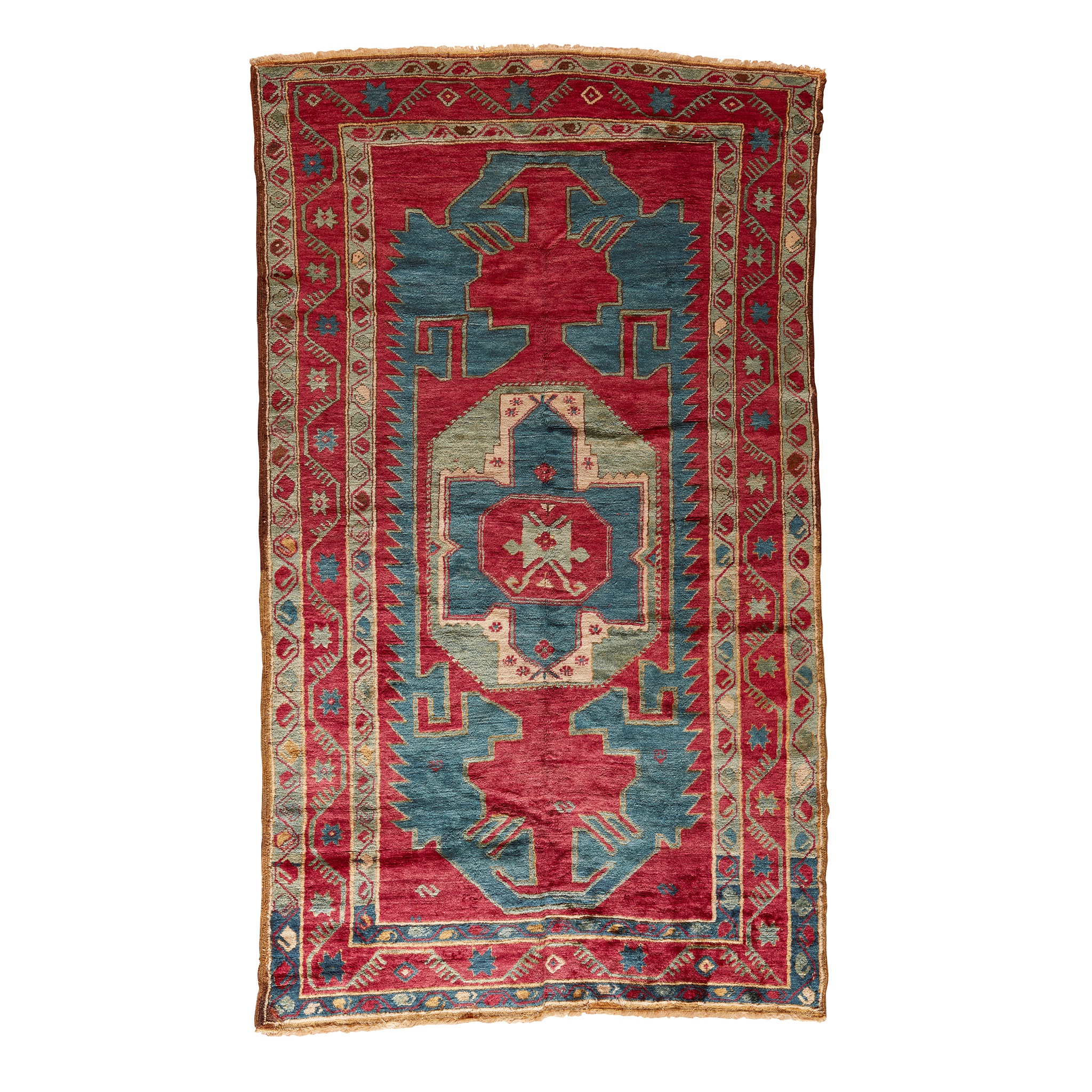 the raspberry red field with blue cruciform medallion, elongated shaped surround, within red star and vine border