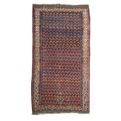 the indigo field with allover boteh pattern, small hook motif to one end, within narrow ivory geometric vine border