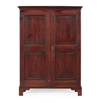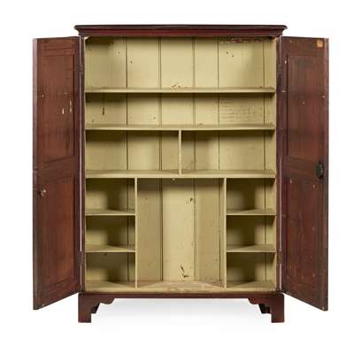 the moulded cornice above a pair of panel doors opening to a painted shelved interior, raised on bracket feet