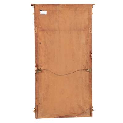 the bead moulded cornice above an eglomisé panel painted with a castle scene, over a rectangular mirror plate flanked by columns