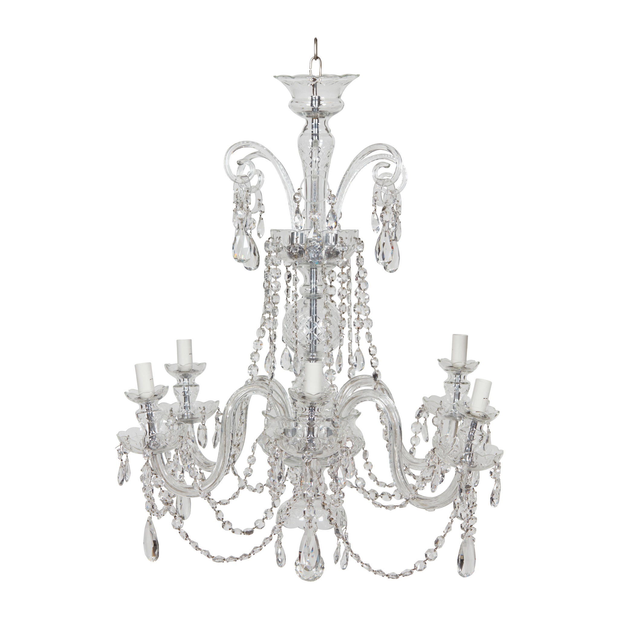 with six scrolling candle arms and branches hung with prism drops, lustres, and swags, electrified