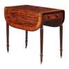 the rounded rectangular top with satinwood banding and drop-leaf sides, above a frieze drawer with ebony key inlay and a dummy drawer opposing, raised on reeded tapered legs ending in brass caps and castors