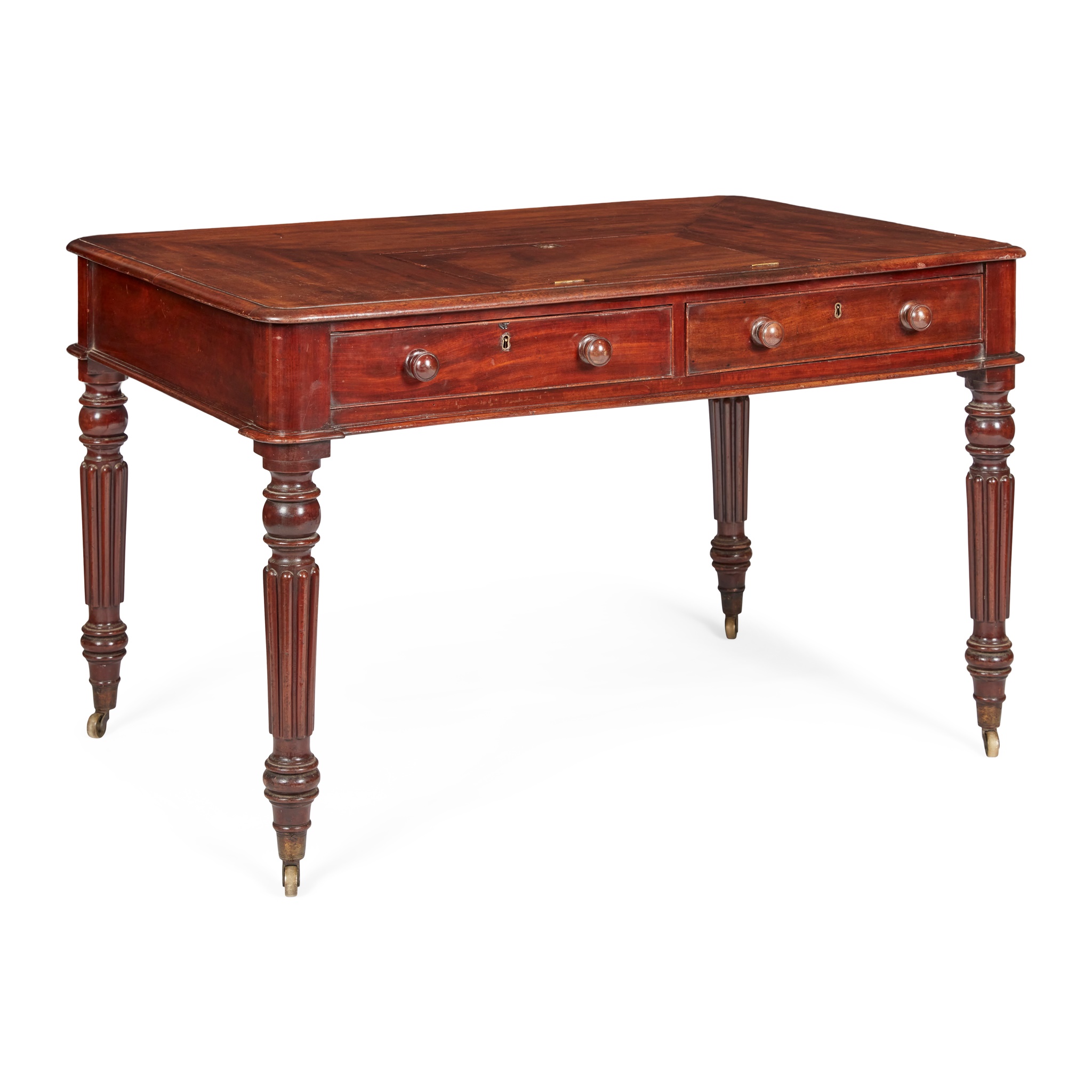 the rounded rectangular top with a moulded edge and a hinged slope with ratchet adjustment, above a pair of short frieze drawers with the same on the reverse, raised on turned and reeded tapering legs ending in brass caps and castors