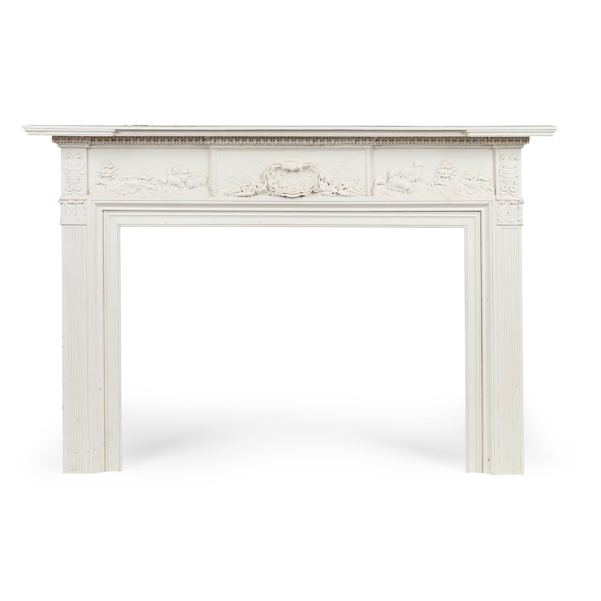 the bead moulded shelf above a frieze with moulded shells, sheep, and goats flanked by urns with horses, with reeded jambs capped with stiff leaves, the whole painted white