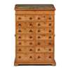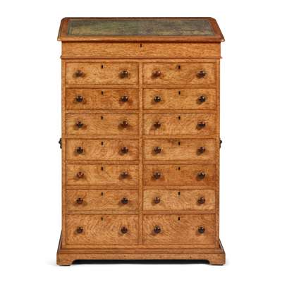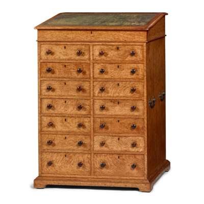 the hinged slope top with a green leather skiver opening to a void interior, above twin banks of seven short drawers, on a plinth base with castors and cast brass handles to the sides, stamped on the interior GILLOW & CO. and GILLOW