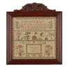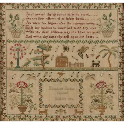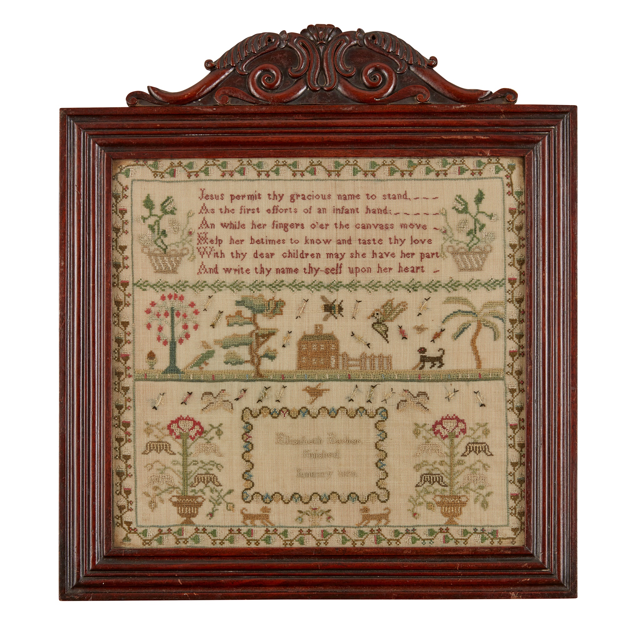 worked in silk and linen thread on a linen ground, with three sections, the top with the prayer 'Jesus permit thy gracious name to stand, - As the first efforts of an infant hand: - An while her fingers o'er the canvass move - Help her betimes to know and taste thy love/ With thy dear children may she have her part/ And write thy name they-self upon her heart -'; above a band with a house and fence, dog, various trees, birds, insects and a bee; the lower field with twin flowering urns, dogs, birds, and insects and a central reserve signed Elisabeth Barber. Finished. January 1820' within a strawberry vine border and enclosed in a moulded period frame with carved scroll cresting