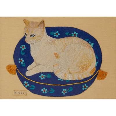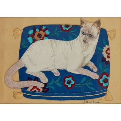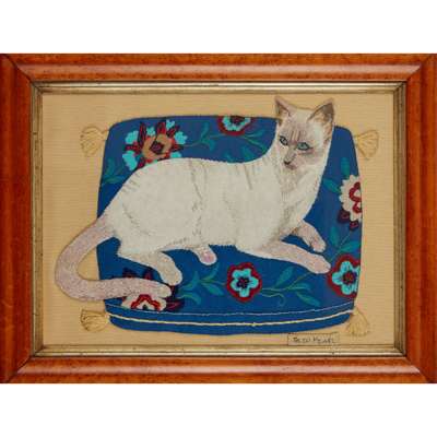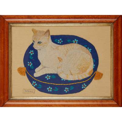 each worked in long stitches on a wool felt ground, the cushions with appliqué flowers and silk tassels against a yellow silk backing, one labelled 'SEED PEARL', the other 'NISSE'; in later birdseye maple frames