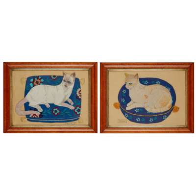 TWO VICTORIAN NEEDLEWORK AND FELT PICTURES OF CATS ON CUSHIONS