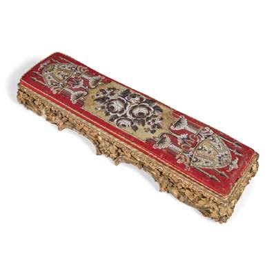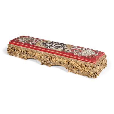 the rectangular padded seat with a beadwork cover, on a leaf and grape carved rocaille base
