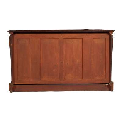 the shaped top over a pair of glazed doors flanked by serpentine glazed doors, all enclosing shelves, flanked and divided by gilt bronze mounted angles with female mask mounts, on base with a scroll apron
