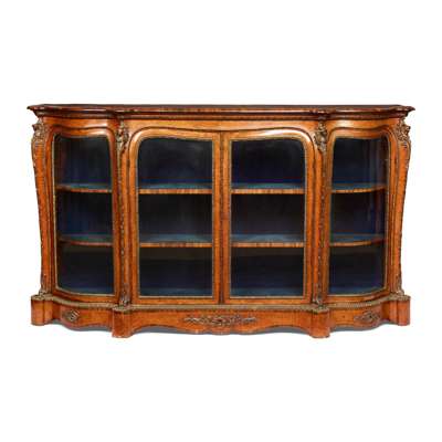 EARLY VICTORIAN KINGWOOD, WALNUT, AND THUYAWOOD SERPENTINE DISPLAY CABINET