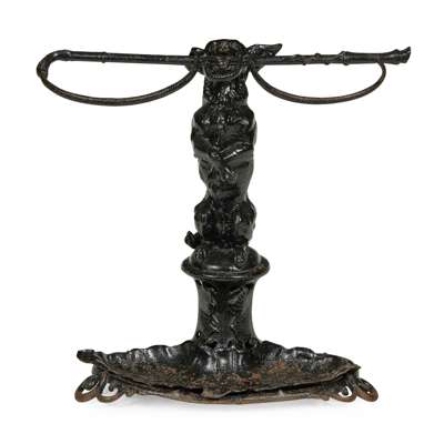 modelled as a begging dog holding a whip in its mouth, above a leaf-form drip pan, painted black with impressed diamond Registration mark and No. 14 and No. 85297