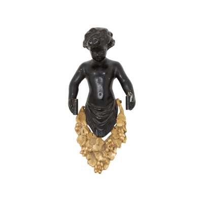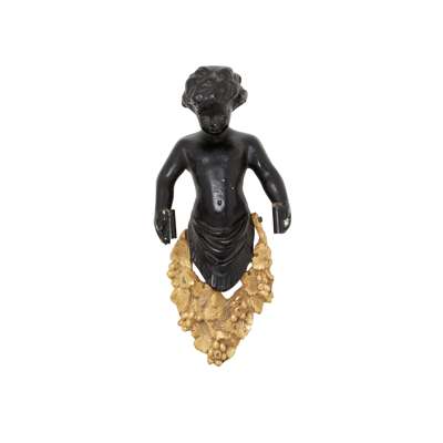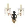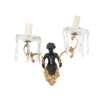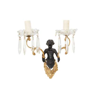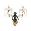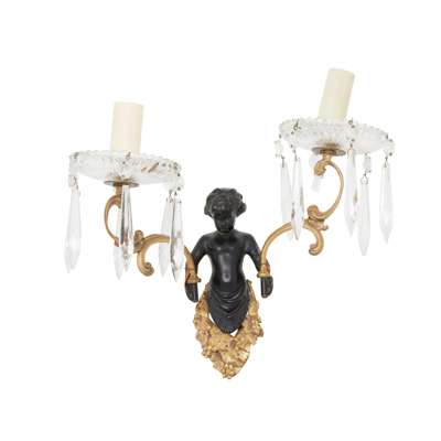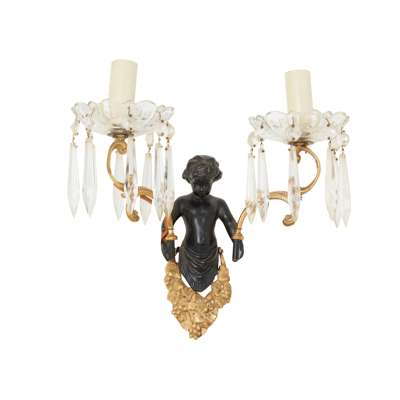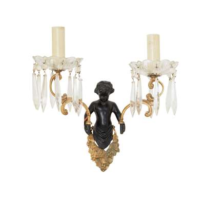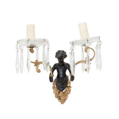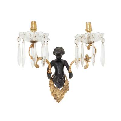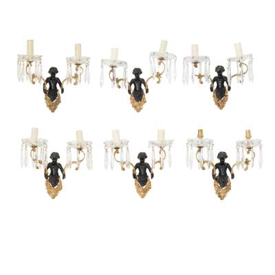 each with a bacchic putto holding aloft twin scrolling candle arms hung with prism drops, four with lobed glass drip pans and two with faceted glass drip pans; together with TWO MATCHING PUTTO BACK PLATES, lacking the candle arms and drops